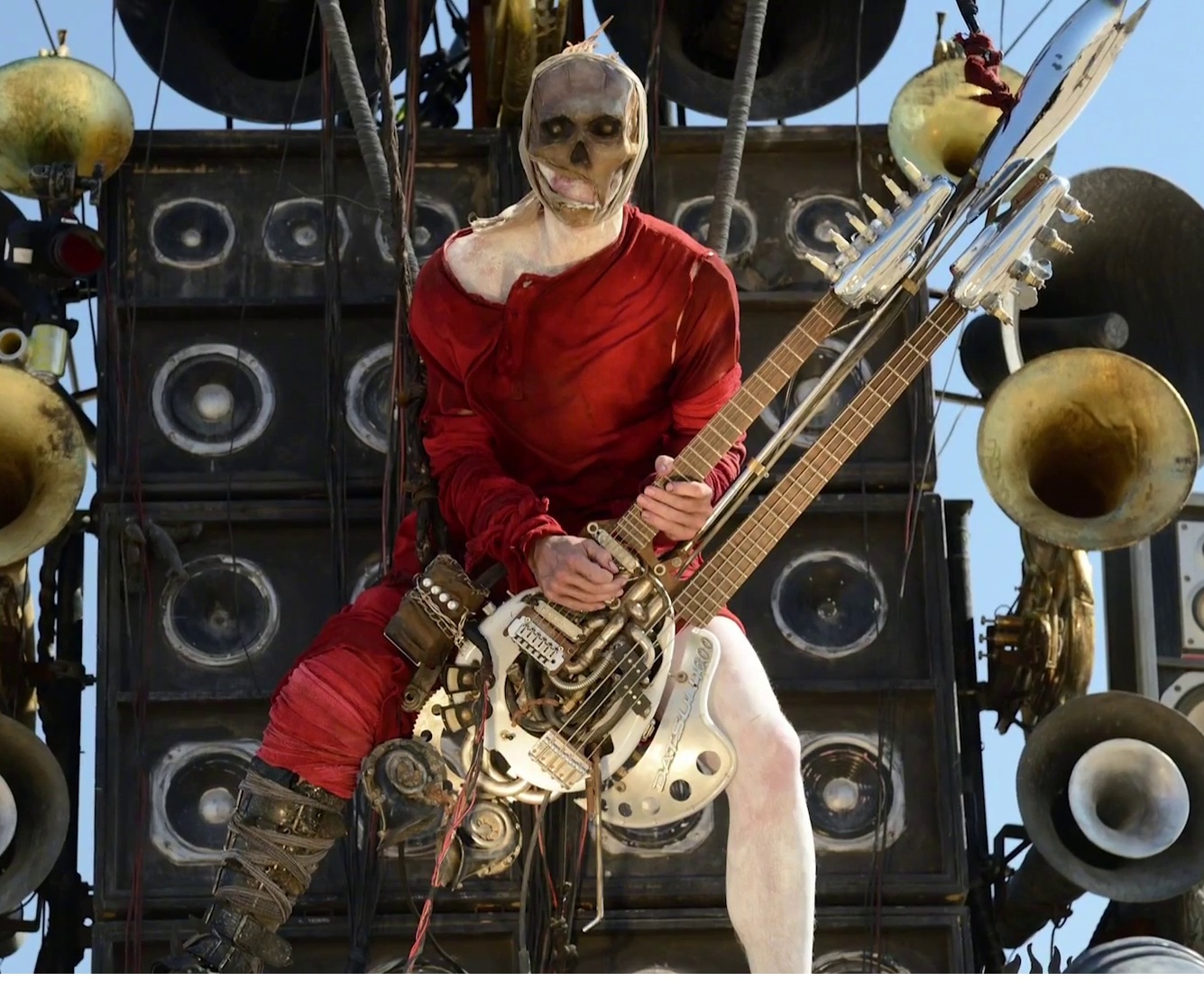 In Mad Max Fury Road 2015 There Is A Character Called The Doof Warrior That Rides A Van Made Out Of Amps While Playing An Electric Guitar That Shoots Fire I Don T